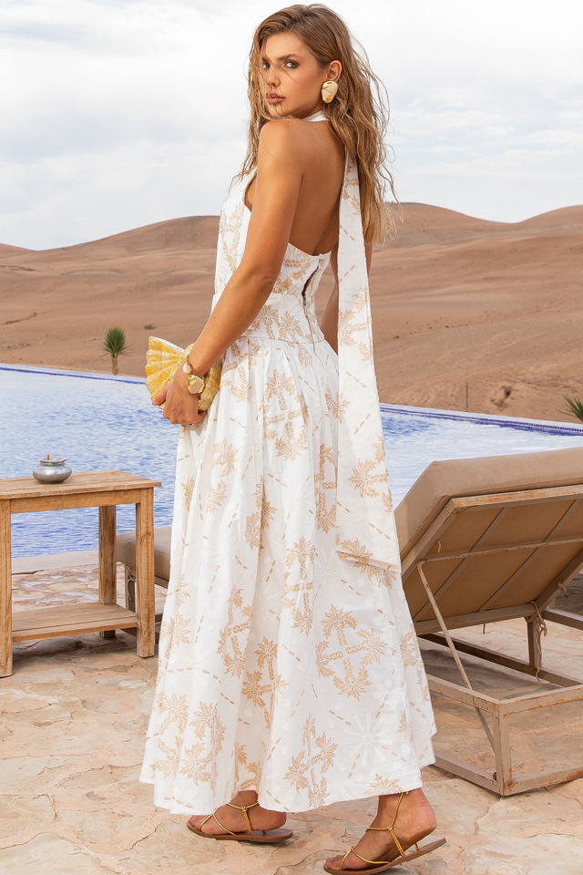 Vestido midi off-white de bordado em tons dourados: sofisticado e único, o vestido apresenta saia franzida e recortes que se ajustam à cintura e ao quadril. O decote com gola alta e cava profunda proporciona um visual elegante, enquanto o ziper nas costas e os abotoamentos com botões revestidos garantem praticidade. O decote ainda conta com uma faixa para amarrar no pescoço.