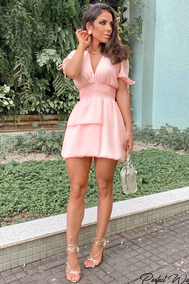 COM DECOTE V PROFUNDO, MANGAS CURTAS BUFANTES COM DETALHES EM PREGAS E PUNHO ELÁSTICO FINO, ALÉM DE CINTURA COM LASTEX E SAIA COM CAMADAS NA PARTE DA FRENTE. GRIFE PERFECT WAY